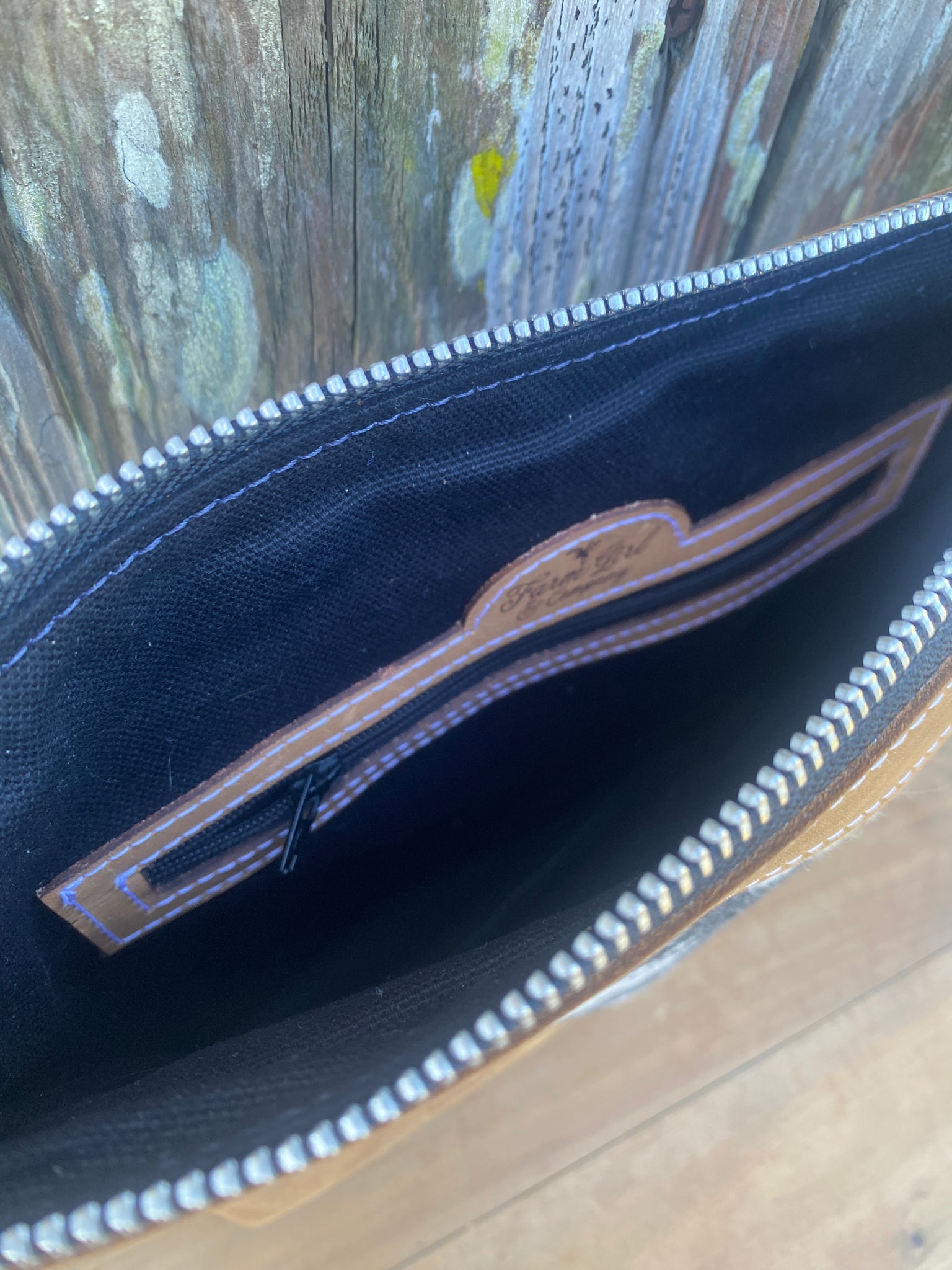 Small concealed carry bag made with chrome tanned pull up leather and hair on cow hide combo . It has a zipper closure, (1) outside concealed pocket and (1) adjustable leather strap. Strap adjusts from 34" to 43". This bag is fully lined with a black canvas and has a zipper pocket. Bag size is 10” wide x 8” high x 2.5” deep. Fits a Glock 43x perfectly. Fits up to 6" gun.