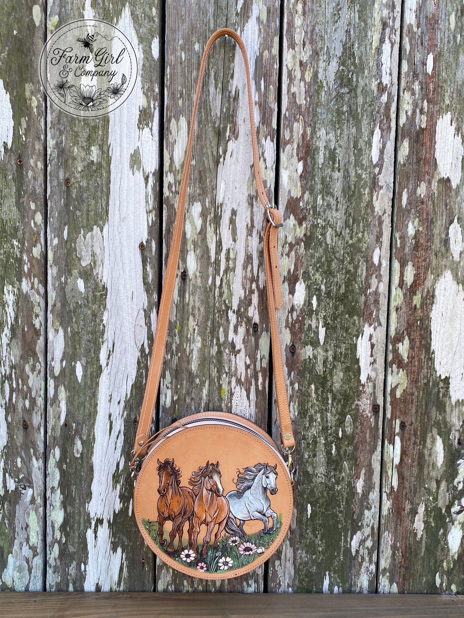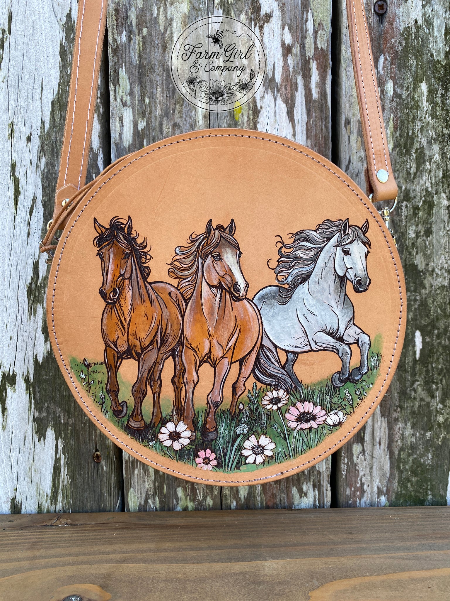 Cantina leather bag, engraved with horses and flowers and then hand painted.